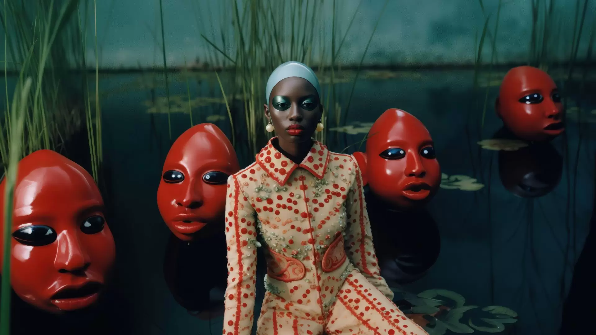 Featured image: The Stillness Was an Act, Series I — A solitary figure faces forward as red, mask-like heads emerge from dark water, evoking themes of memory, resistance, and imagined futures within an Afro-surrealist landscape.
